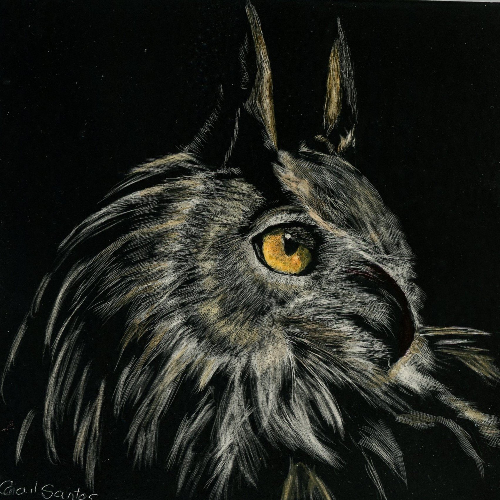 Great Horned Owl, Gail Santos, Scratchboard, $150.